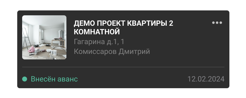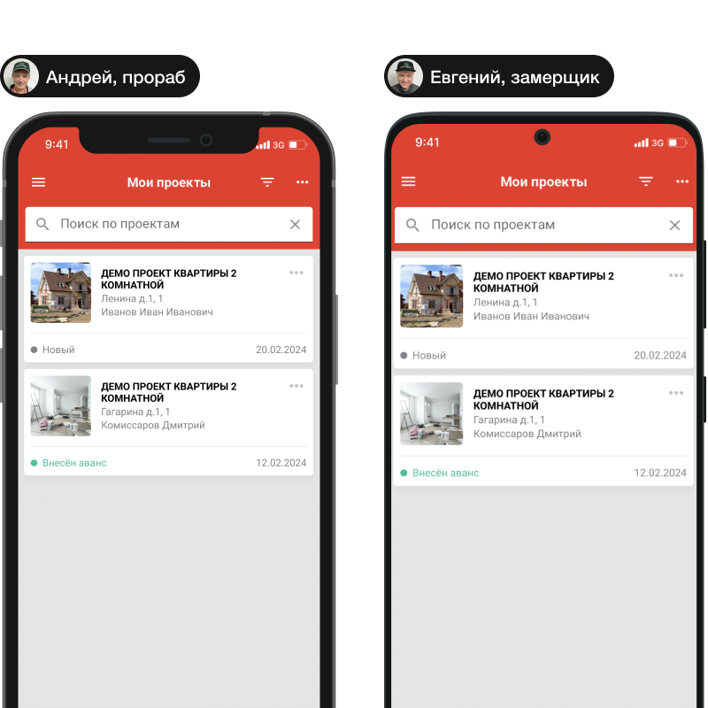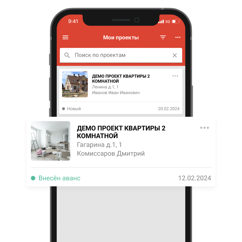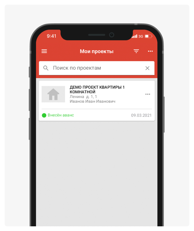 To create a project, on the main screen tap “Add project”, then enter the project details — name, address, apartment number, floor, and the customer’s full name which will appear in acts. Also add phone and email, then save.