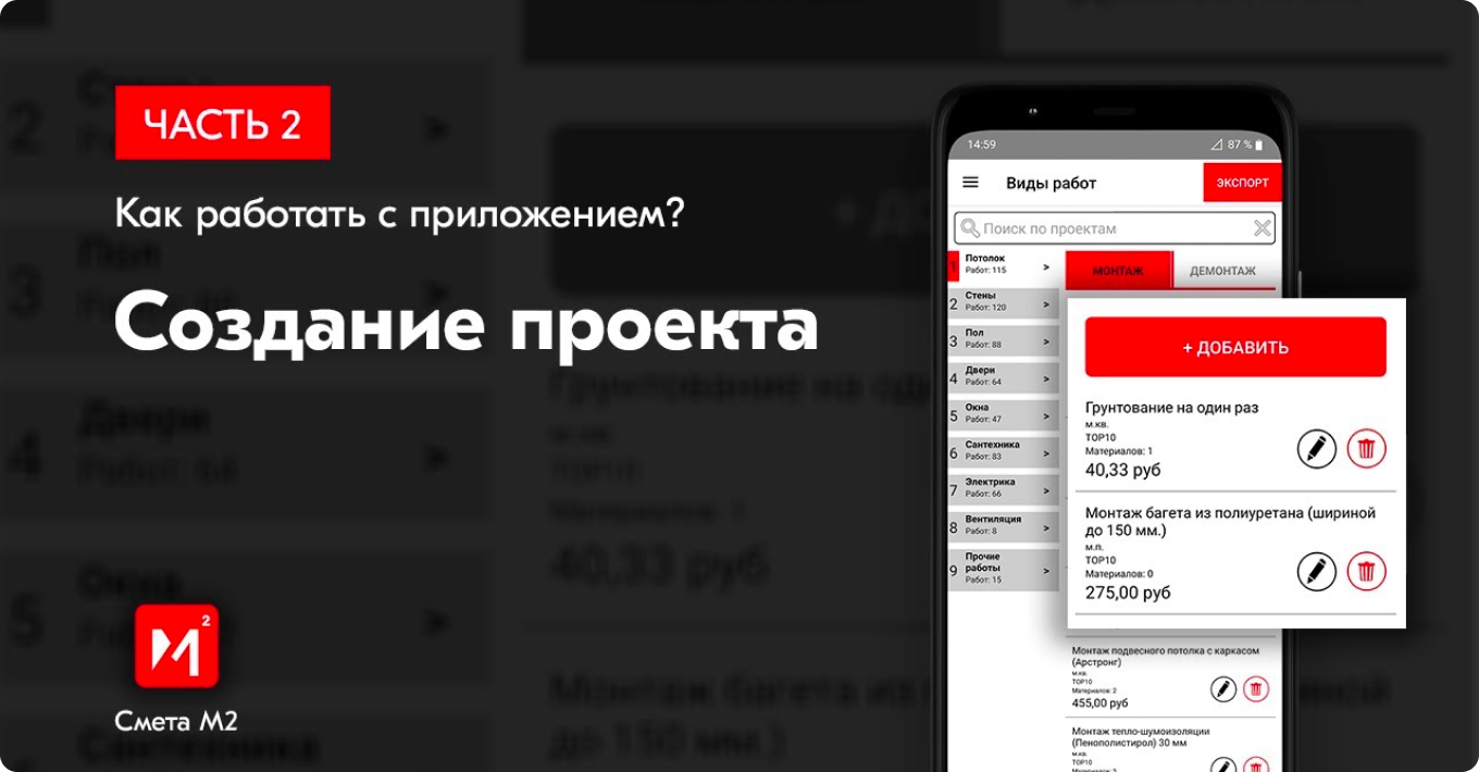 To add work types, open the main menu → “Work types”. Tap the round “+” button, choose “Add work types” or “Add work groups”. Enter the work name, select its stage (installation/dismantling), applicability (ceiling/walls/floor/doors, etc.), units, price, and contractor price. Optionally add a material with its consumption, then save.