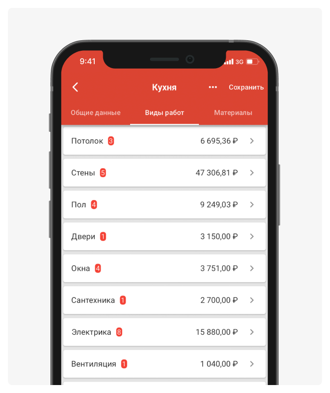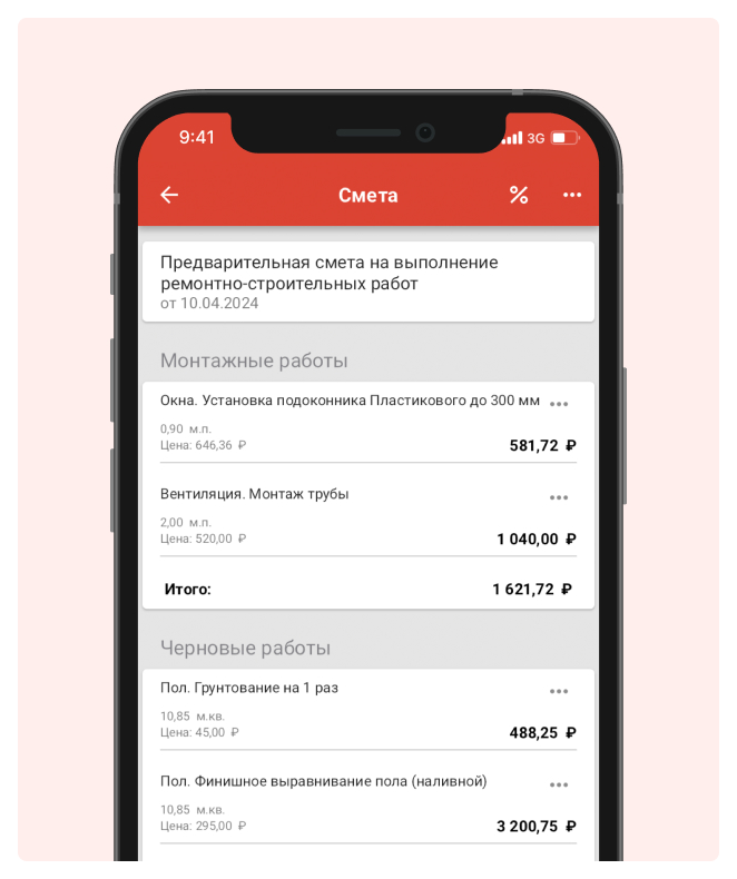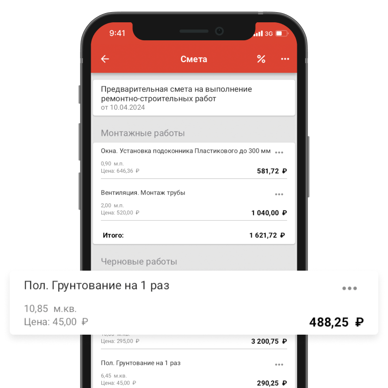Reporting is fast and you can easily apply discounts with or without materials. Prices and work items can be adjusted to your needs. I like that you can quickly select a ready-made bundle (putty, primer, wallpaper), and there’s no need to write everything out in Excel for long.