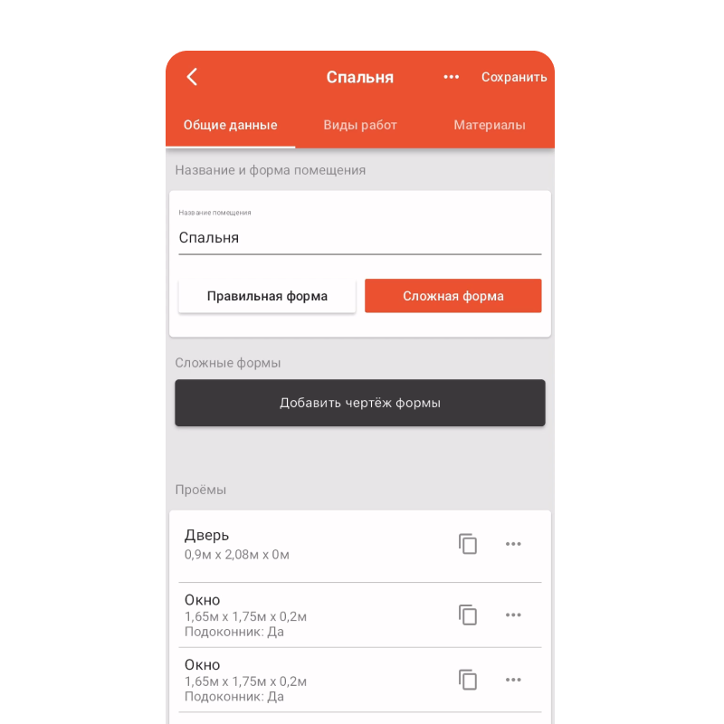 Deep settings for each room — measurements, room drawing, work types and materials